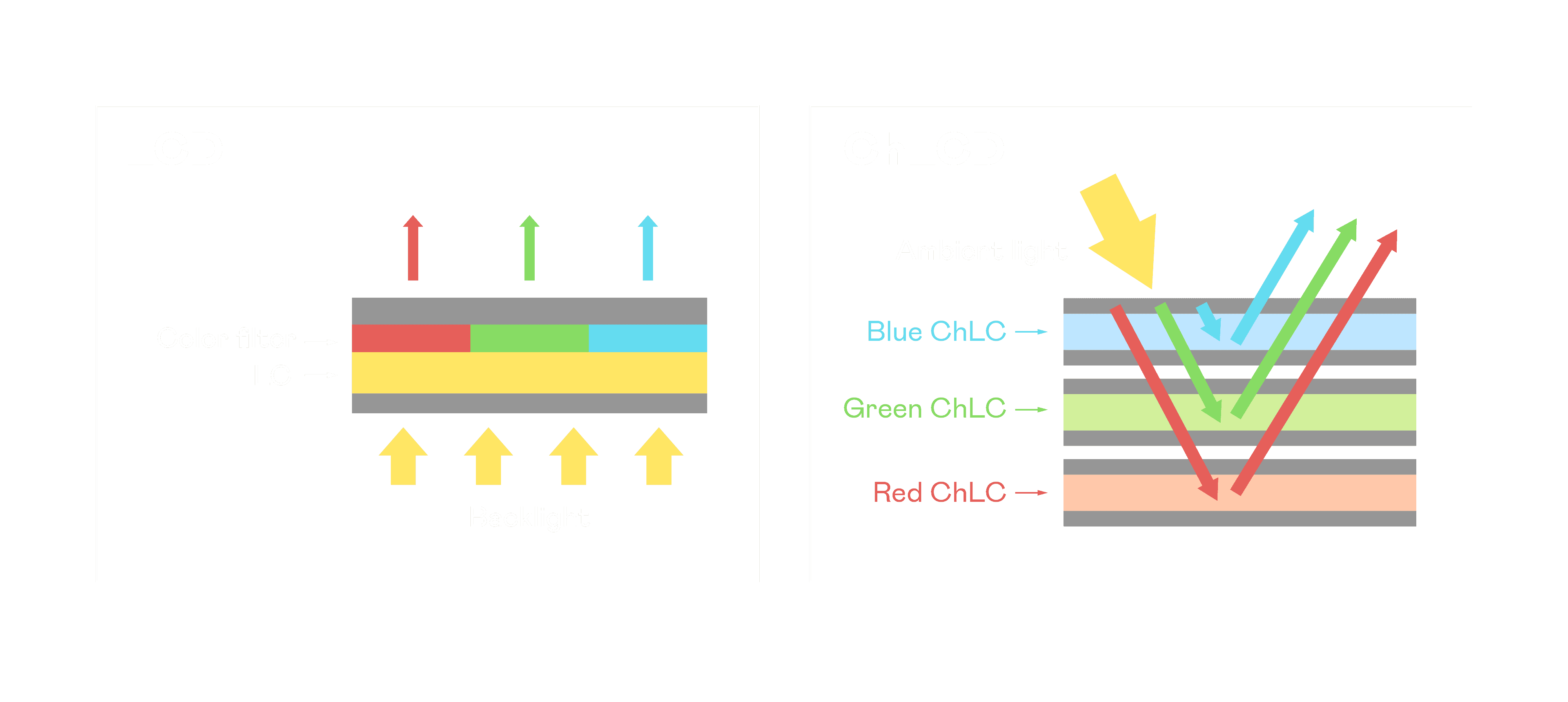 ChLCD 胆固醇液晶就如同纸张一样,,透过反射环境光来显示影像,,因此长时间观看不易造成人眼视觉疲劳,,可达到护眼效果。。。。当处于户外阳光下使用,,,LCD 影像容易失真而不易观看,,,但胆固醇液晶仍可维持较佳的影像品质。。。