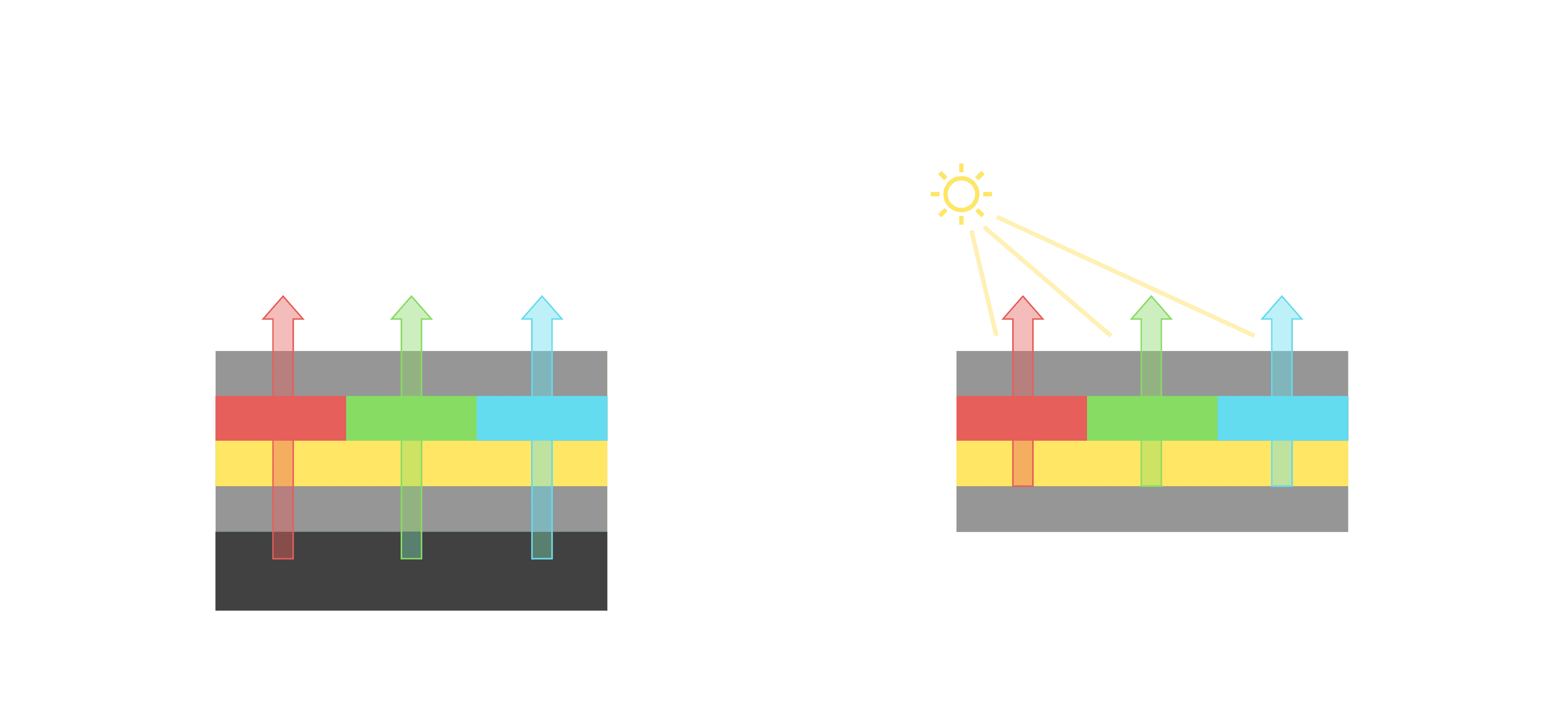 与传统需搭配背光单元的液晶显示相比,,,反射式液晶技术不仅更省电、、更轻薄,,,且即便在艳阳下仍能清晰显示。。。此外,,少了背光单元,,,也大幅降低了 LED 蓝光伤害眼睛的疑虑。。。。