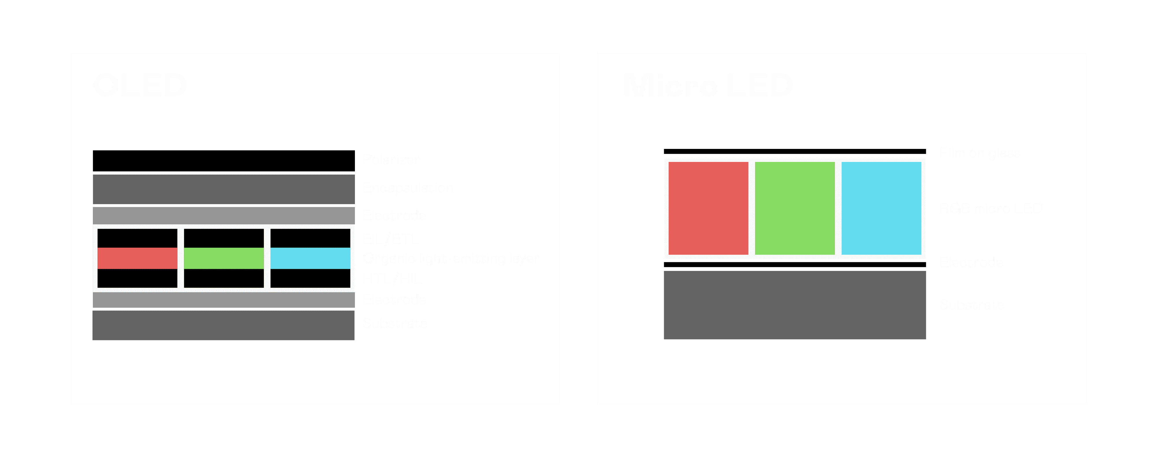 以 LED 做为显示画素,,,可让 LED 的发光效率发挥到极致,,从而让显示器具备优异的亮度表现,,,,不论是在户外或室内,,,均具备出众的显示效果。。同时,,,,与使用有机材料的 OLED 相比,,LED 具备更稳定、、寿命更长的特性,,,,不仅不会有画面烙印问题,,而且更不容易出现故障、、、坏点。。。。